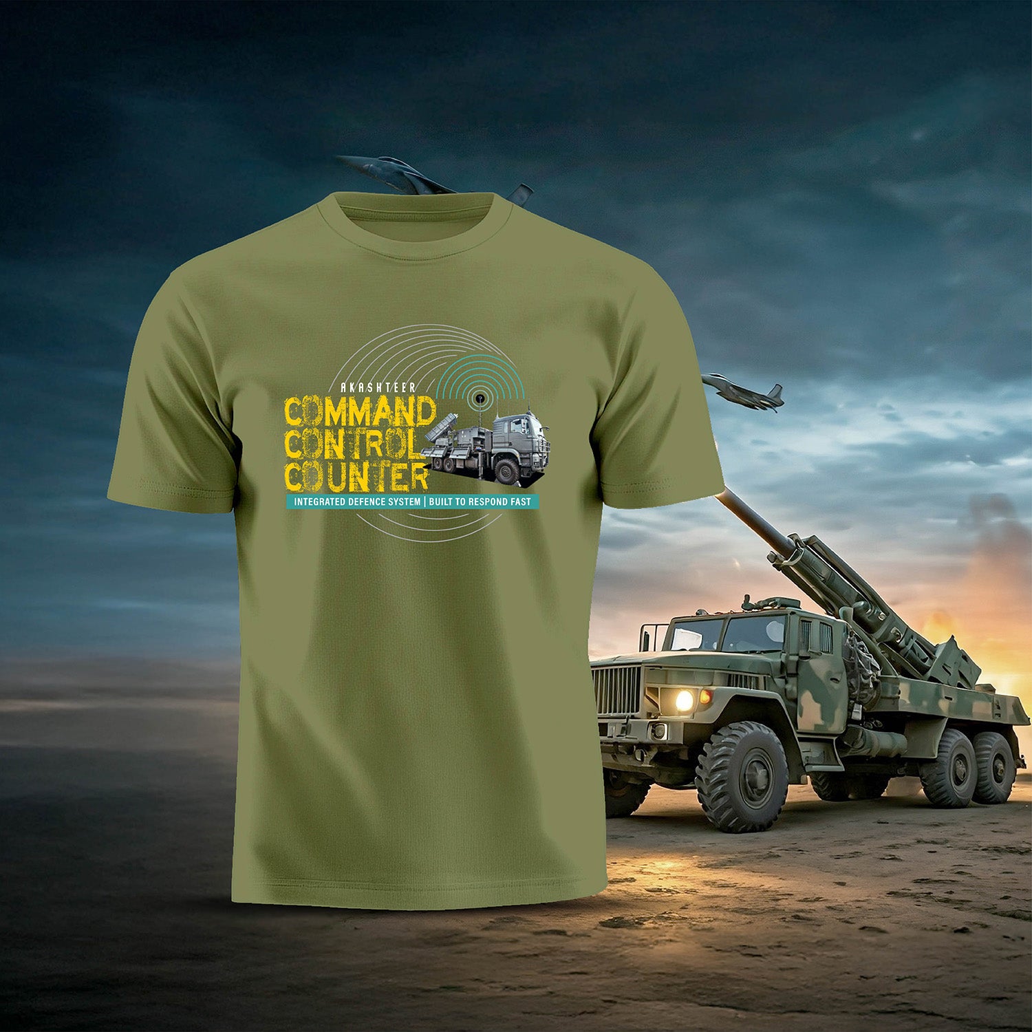 Luv My India's Akashteer pure cotton round neck unisex T-Shirt salutes the silent guardians of our skies — the Akashteer air defence system, India’s cutting-edge digital command network that ensures no threat goes unseen. It’s a symbol of India’s readiness to protect its skies with precision, power and indigenous intelligence. It’s also a tribute to DRDO’s quiet excellence and the Army’s sharp reflexes.