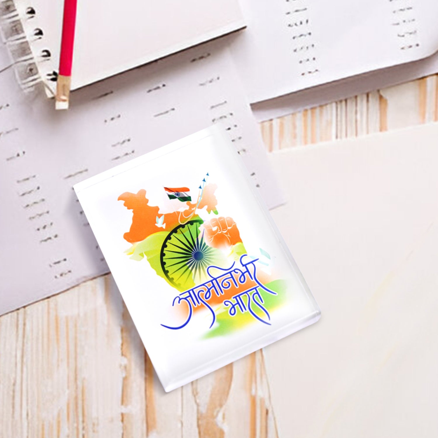 Luv My India's Aatmanirbhar Bharat Tricolour patriotic Paperweight represents the vision of a self-sustaining, ever-progressing India. More than holding down documents, it holds up an idea that when we rely on our own people, talent and traditions, Bharat thrives. It is made from high-quality material like Acrylic and offers both durability as well as elegance, making it a perfect addition to your office or home desk.