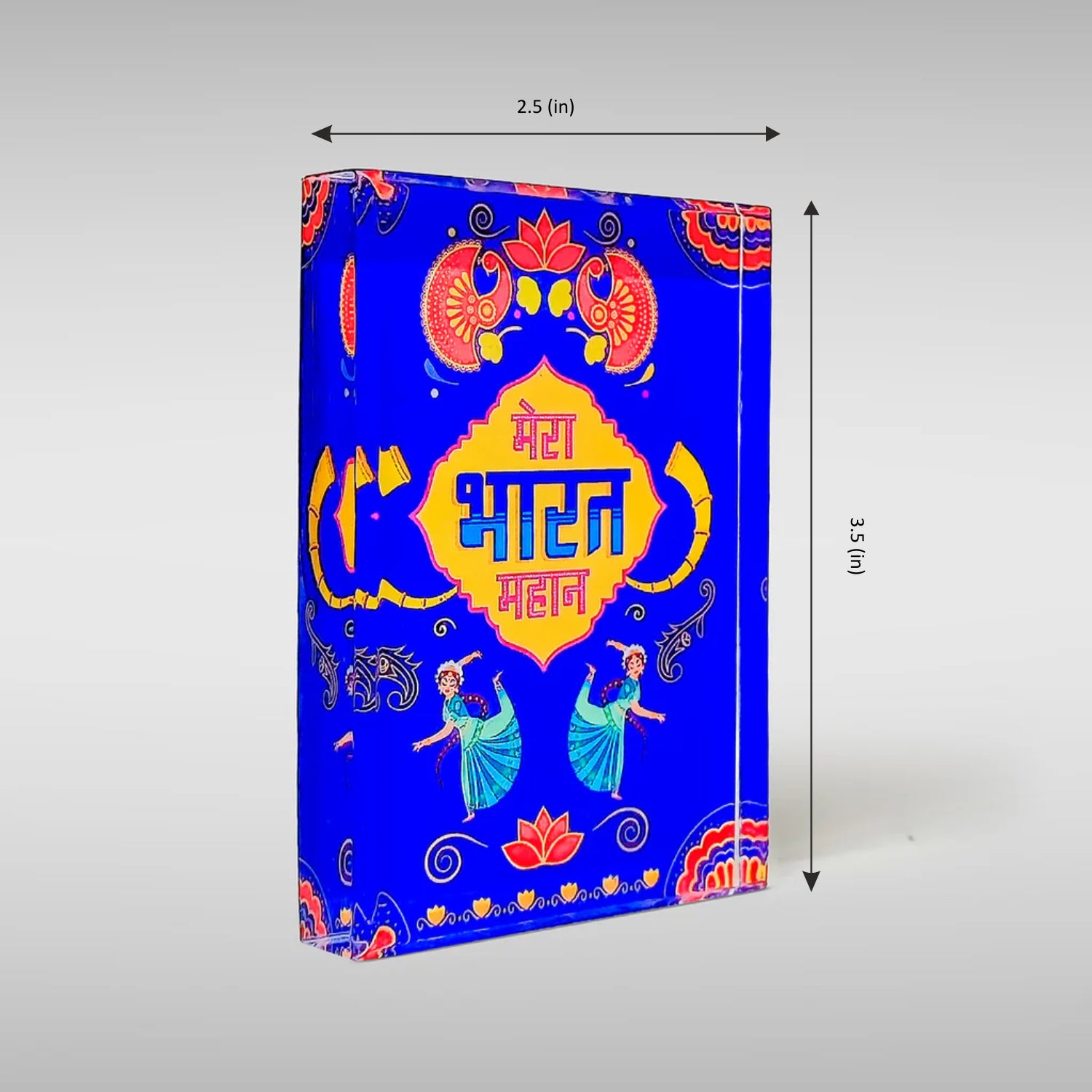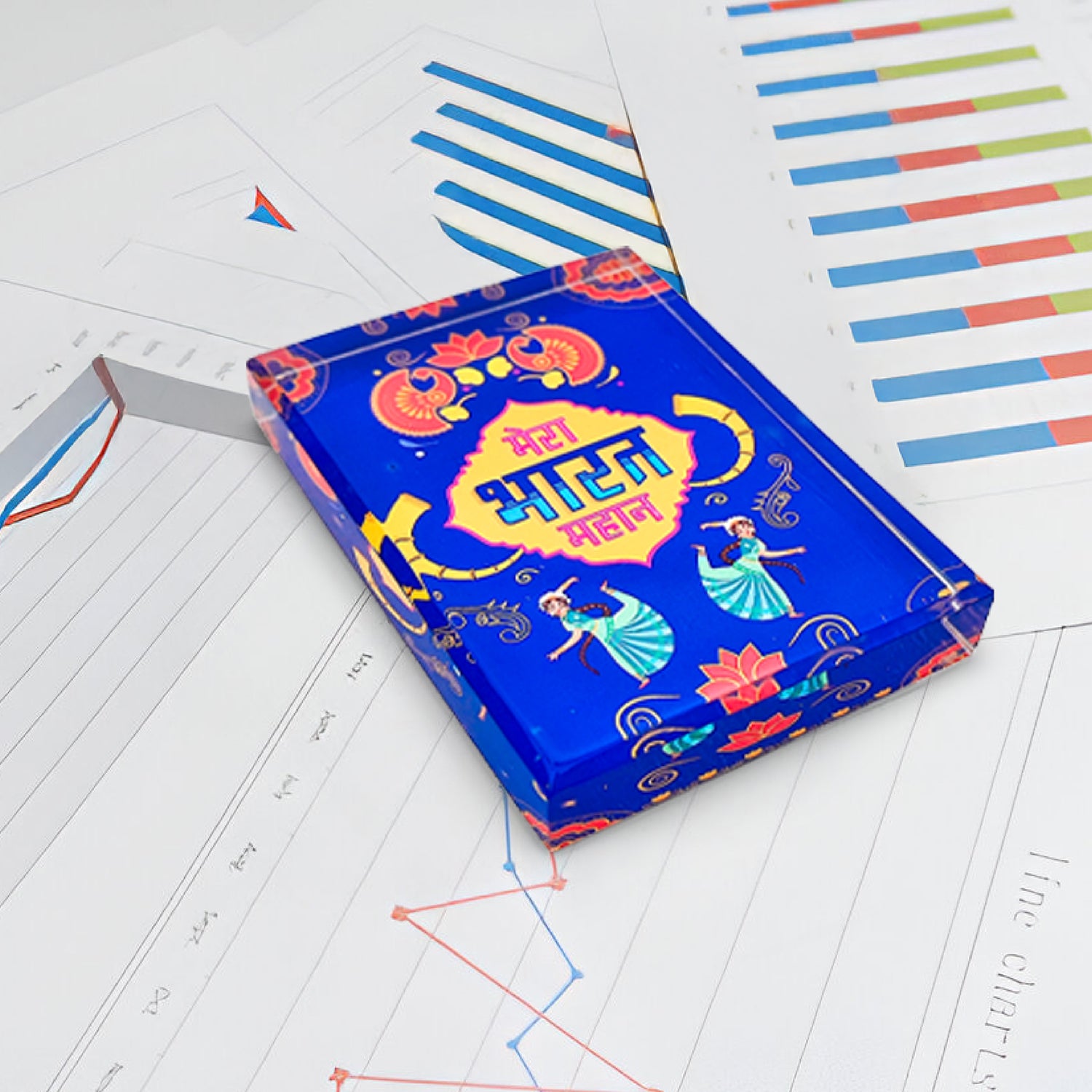Luv My India's patriotic Mera Bharat Mahan Paperweight is a stunning accessory that beautifully blends functionality with national pride. It is made from high-quality material like Acrylic and offers both durability as well as elegance, making it a perfect addition to your office or home desk.