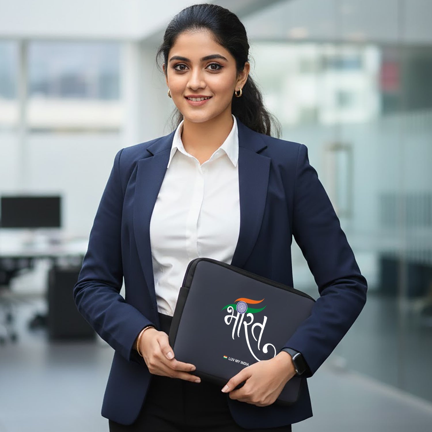 Luv My India's Bharat themed black waterproof Laptop Sleeve Bag narrates the story of our freedom, unity and Tiranga. Durable on the outside and meaningful within, it’s made for those who carry their patriotism as proudly as their purpose. Let your every move echo the values that built a nation.