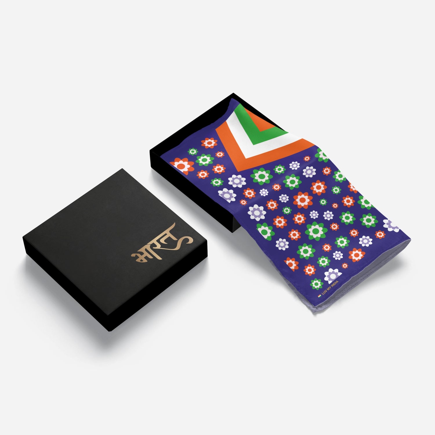Inspired by India’s timeless identity, Luv My India's 33x33 cm Tricolour Bloom digital print Bemberg Vegan Silk Pocket Square brings together saffron, white and green in a graceful floral rhythm. The repeating tricolour motif comes together like a blossom just like the people who make India whole. It represents harmony, continuity and strength that defines Bharat.