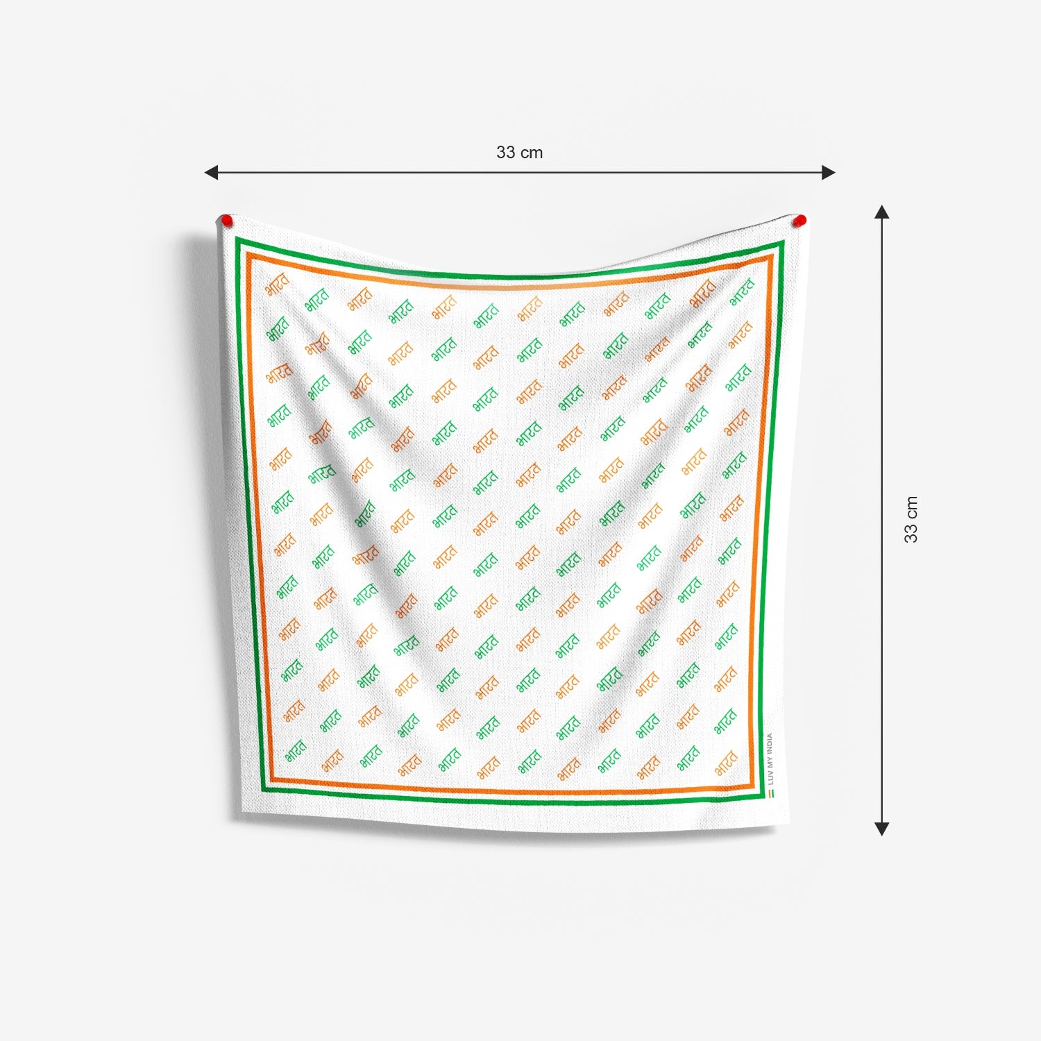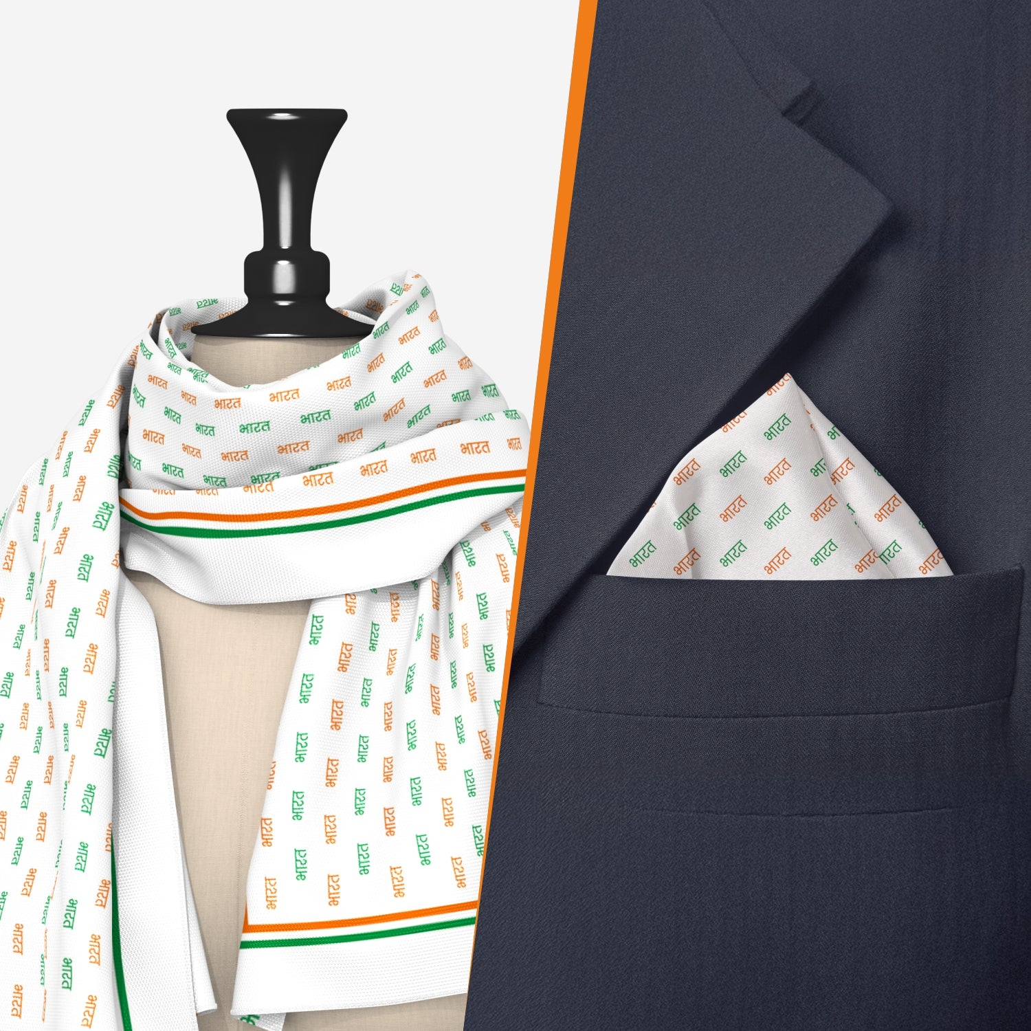 Celebrate the spirit of the nation with Luv My India’s Bharat In Tricolour Pocket Square & Scarf Combo Pack, a timeless ode to our pride and identity. The design features the word Bharat in the vibrancy of the Indian tricolour — saffron, white and green. Crafted in luxurious Bemberg Vegan Silk, the 150x45 cm Scarf and 33x33 cm Pocket Square together blend heritage with refinement, becoming a true reflection of India’s heart and harmony.