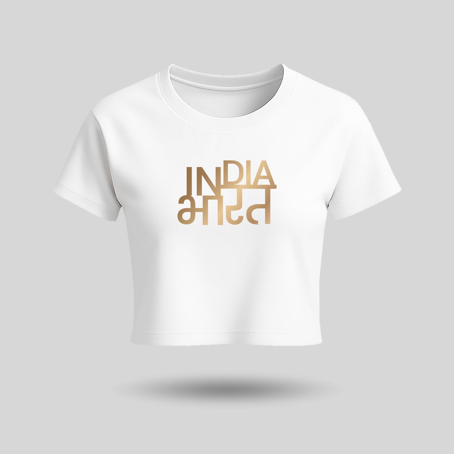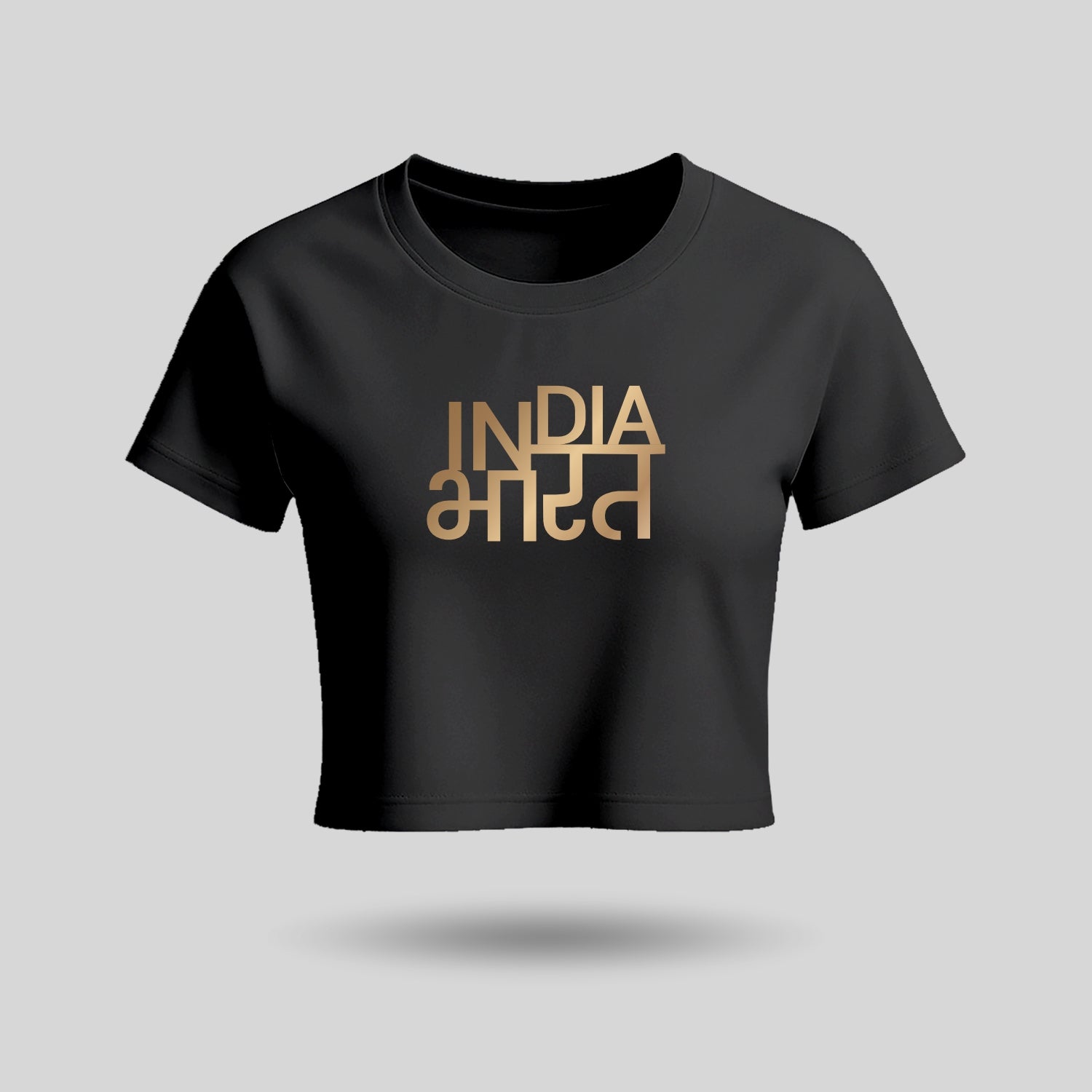 India Bharat | Gold Foil Round Neck Women's Crop Top T-Shirt | Pure Cotton Luv My India Fashion | Patriotic T-Shirt