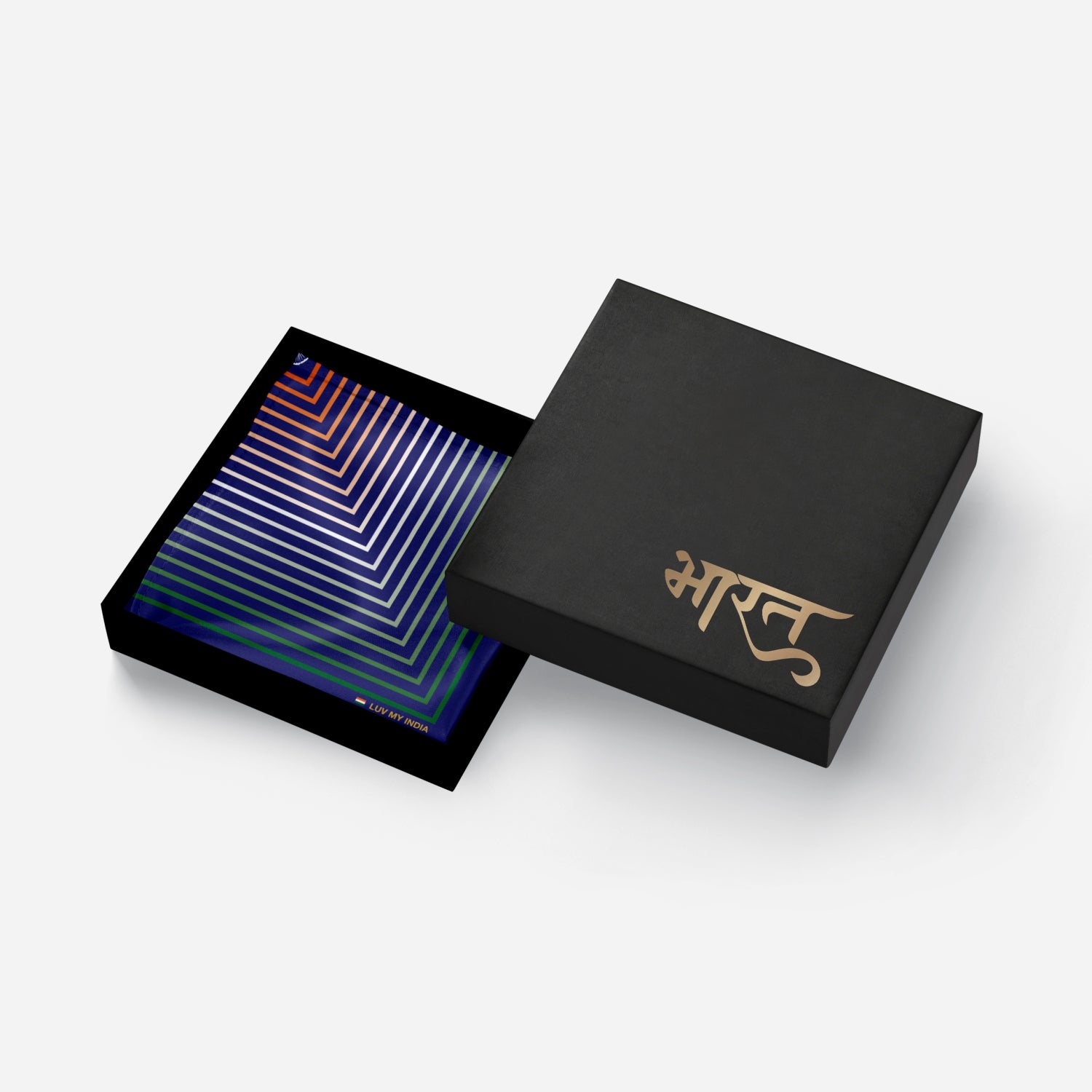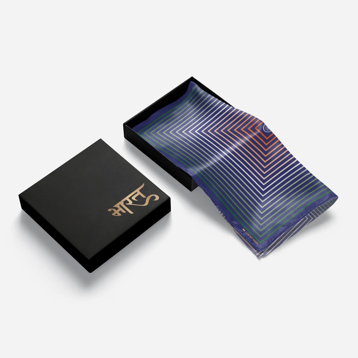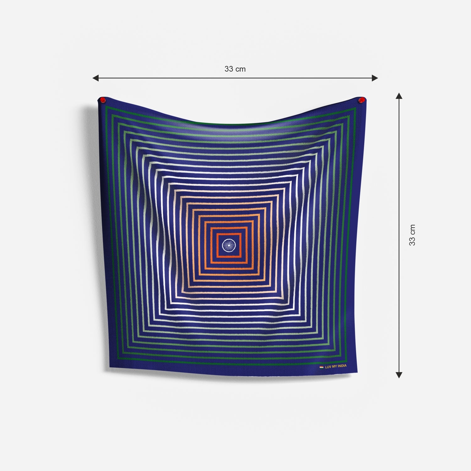 Carry the heart of the nation in every fold with Luv My India’s 33x33 cm digital print Bemberg Vegan Silk Pocket Square. Designed with layered squares in saffron, white, green and deep blue, the pattern draws the eye towards the Ashoka Chakra at its centre—symbolising truth, resilience and eternal motion. The bold indigo backdrop reflects depth and dignity, while the tricolour geometry celebrates unity in diversity. More than an accessory, it is a tribute to India’s spirit. It is perfect for moments of pride, celebration and elegance.