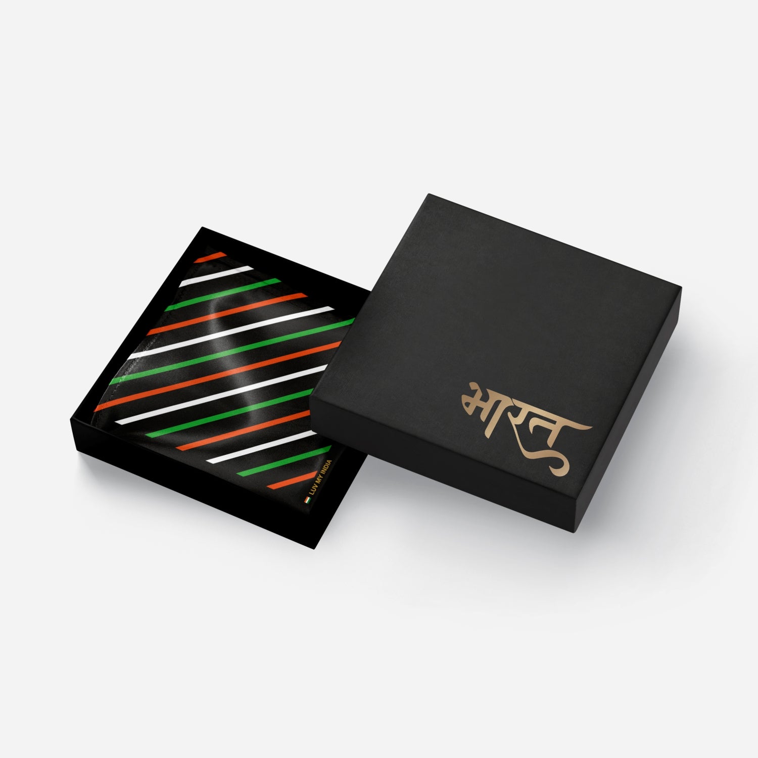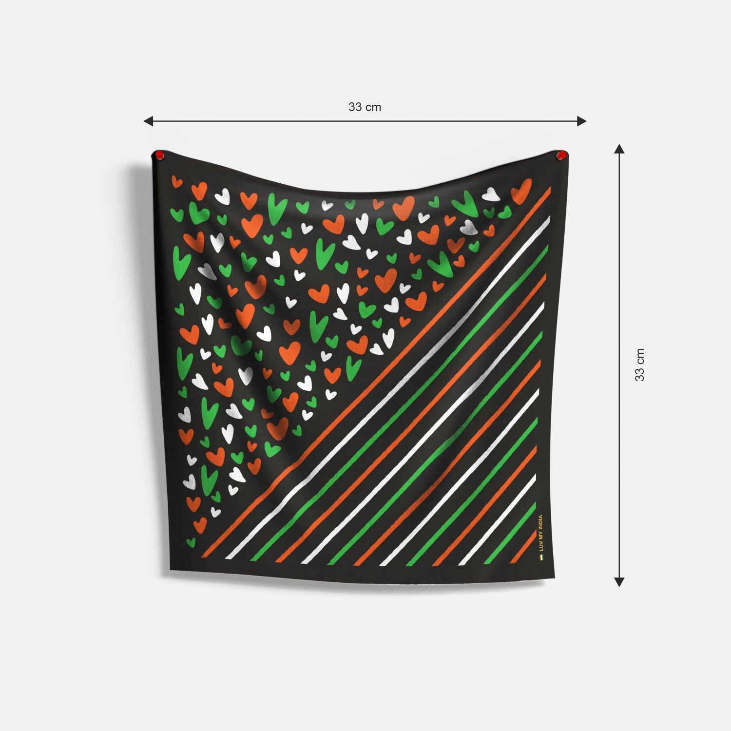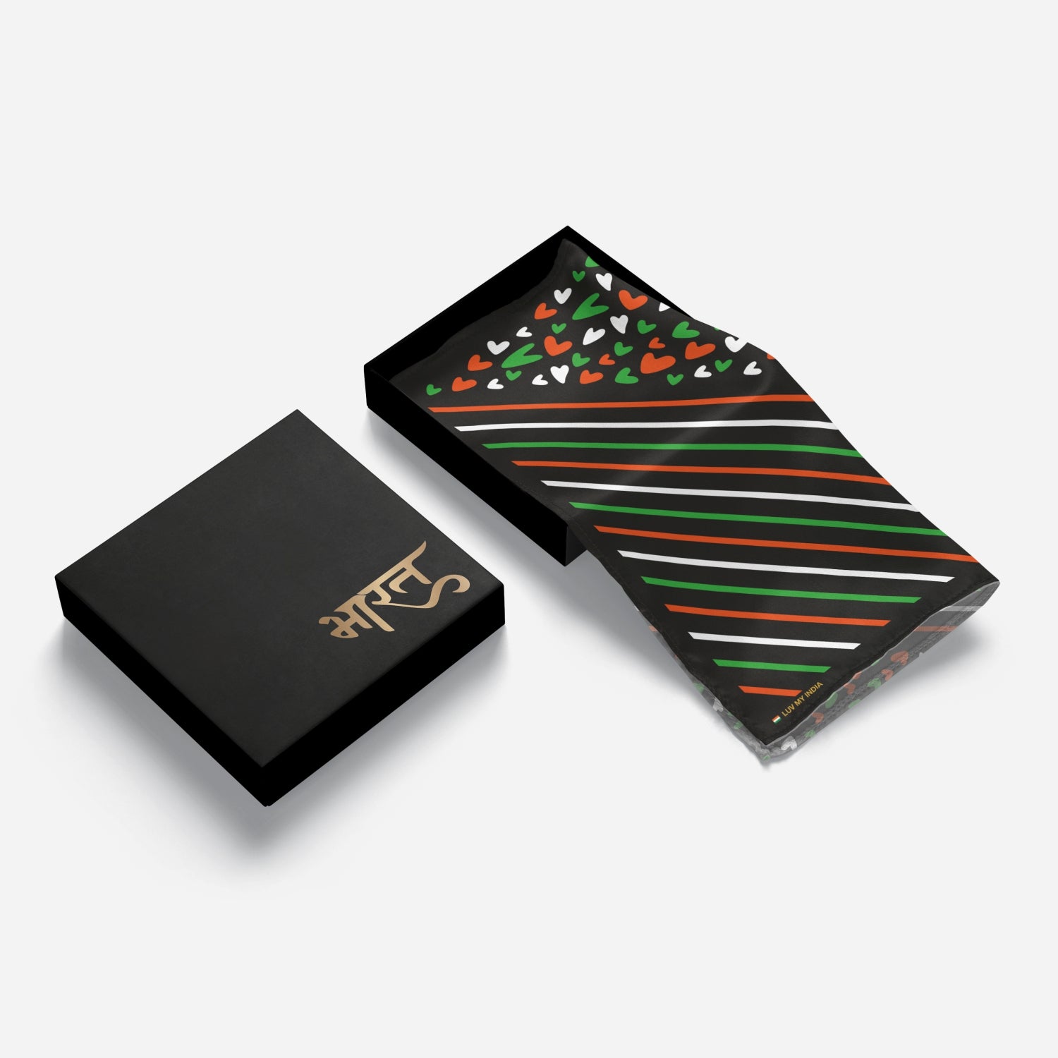 Step into timeless elegance with Luv My India’s 33x33 cm digital print Bemberg Vegan Silk Pocket Square, featuring tricolour lines along with hearts. Its concentric design of saffron, white and green echo the layers of our nation’s journey—courage that fuels us, peace that grounds us and growth that carries us forward. The hearts reminds us of progress, unity and an eternal bond with our motherland. A modern ode to patriotism, it is perfect for festive wear, national celebrations or elevating a sophisticated ensemble with meaning and pride.