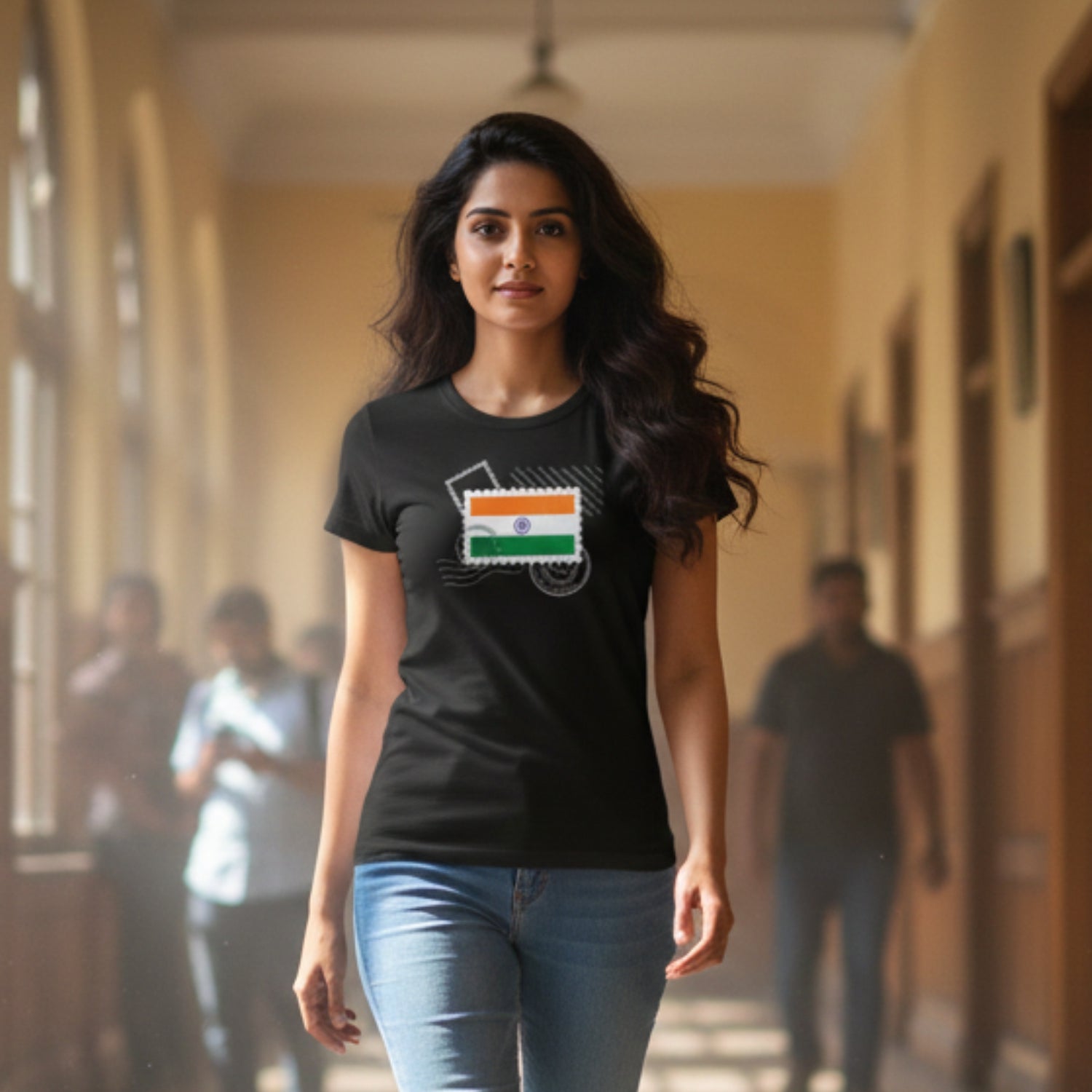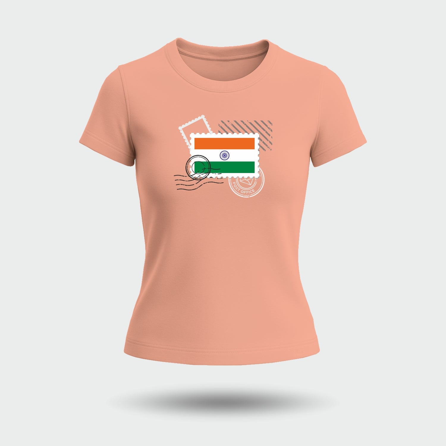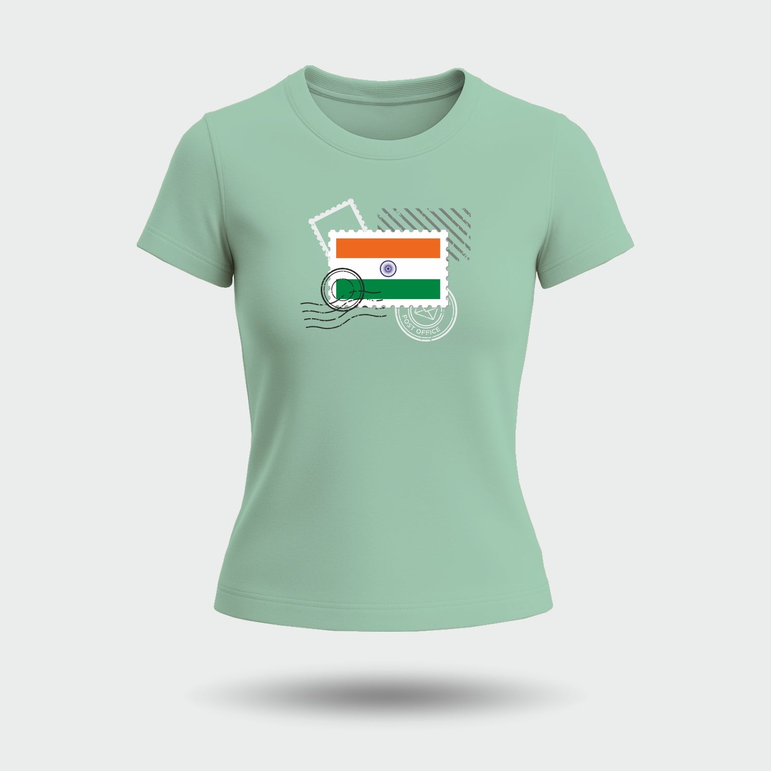 Luv My India's pure cotton round-neck women’s T-shirt features the Indian Tiranga in a vintage stamp format, a timeless salute to the idea of India that travels across hearts and generations. Because India isn’t just a nation, it’s a message proudly worn.