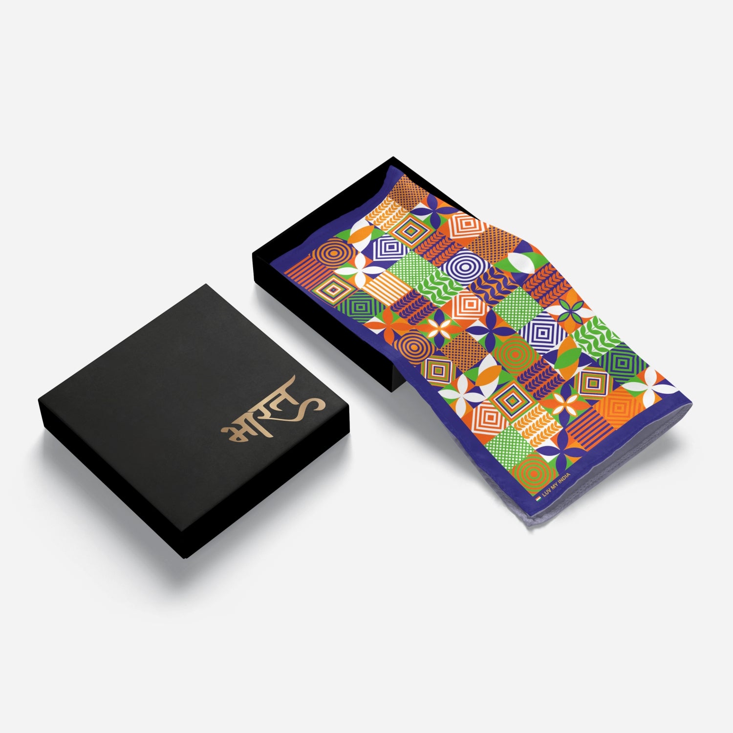 Celebrate the colours of patriotism with Luv My India’s 33x33 cm digital print Bemberg Vegan Silk Pocket Square Vibrant India Pocket Square. Featuring multiple tricolour-inspired designs on a single canvas, it reflects the energy, vibrancy and rhythm of Bharat. Bold yet refined, it’s crafted to add a statement of pride and elegance to both formal and festive ensembles.