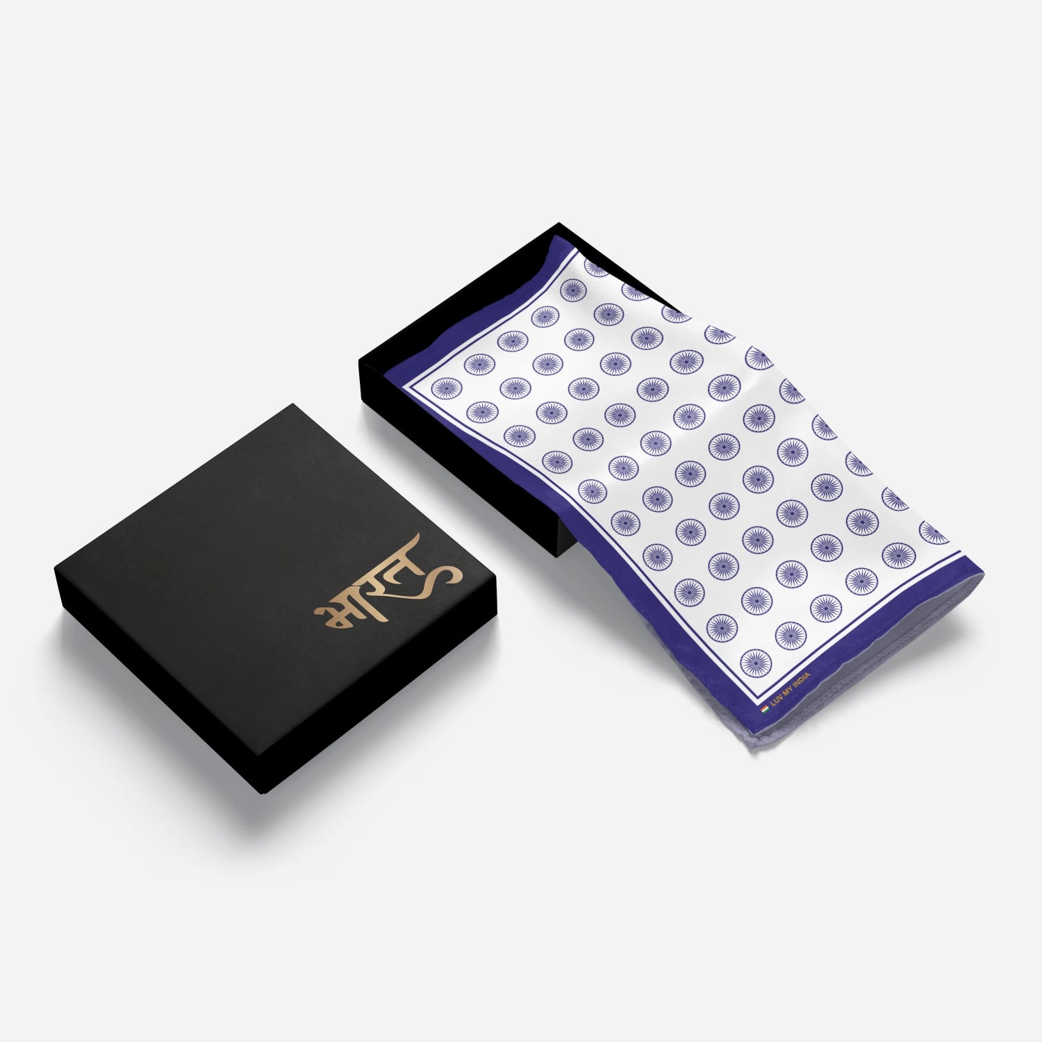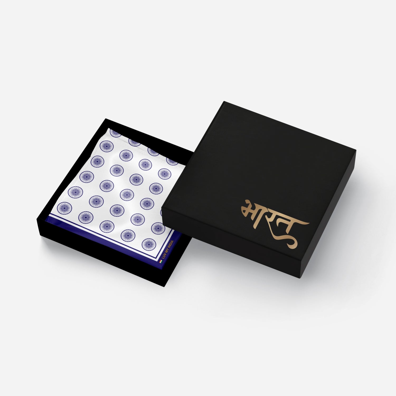 White Ashok Chakra | Luv My India Bemberg Vegan Silk White Pocket Square | Digital Print 33x33 CM Patriotic Premium Pocket Square