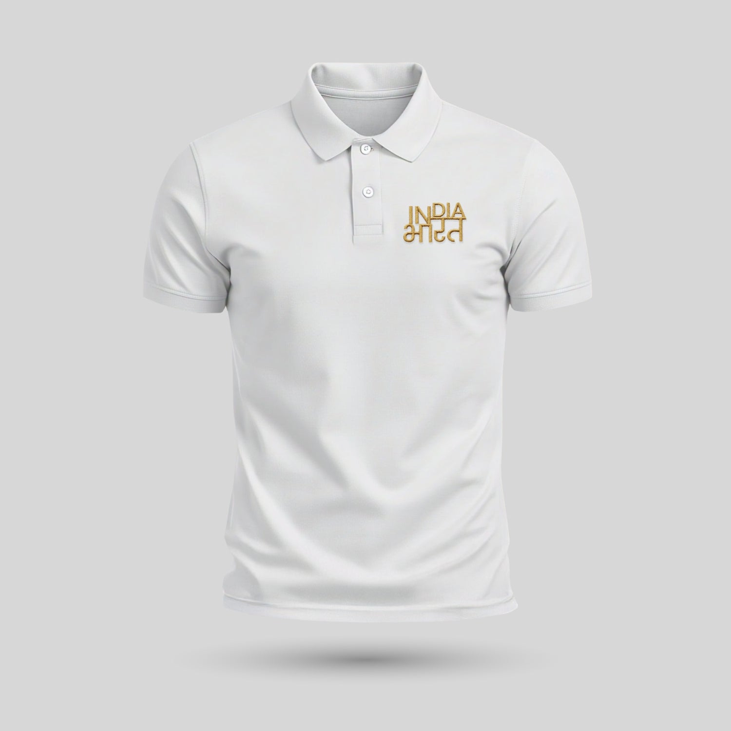 India Bharat | Metallic / Zari Thread Golden Embroidery | PCPQ Polo Neck Unisex T-Shirt | Pure Cotton Luv My India Fashion | Patriotic T-Shirt