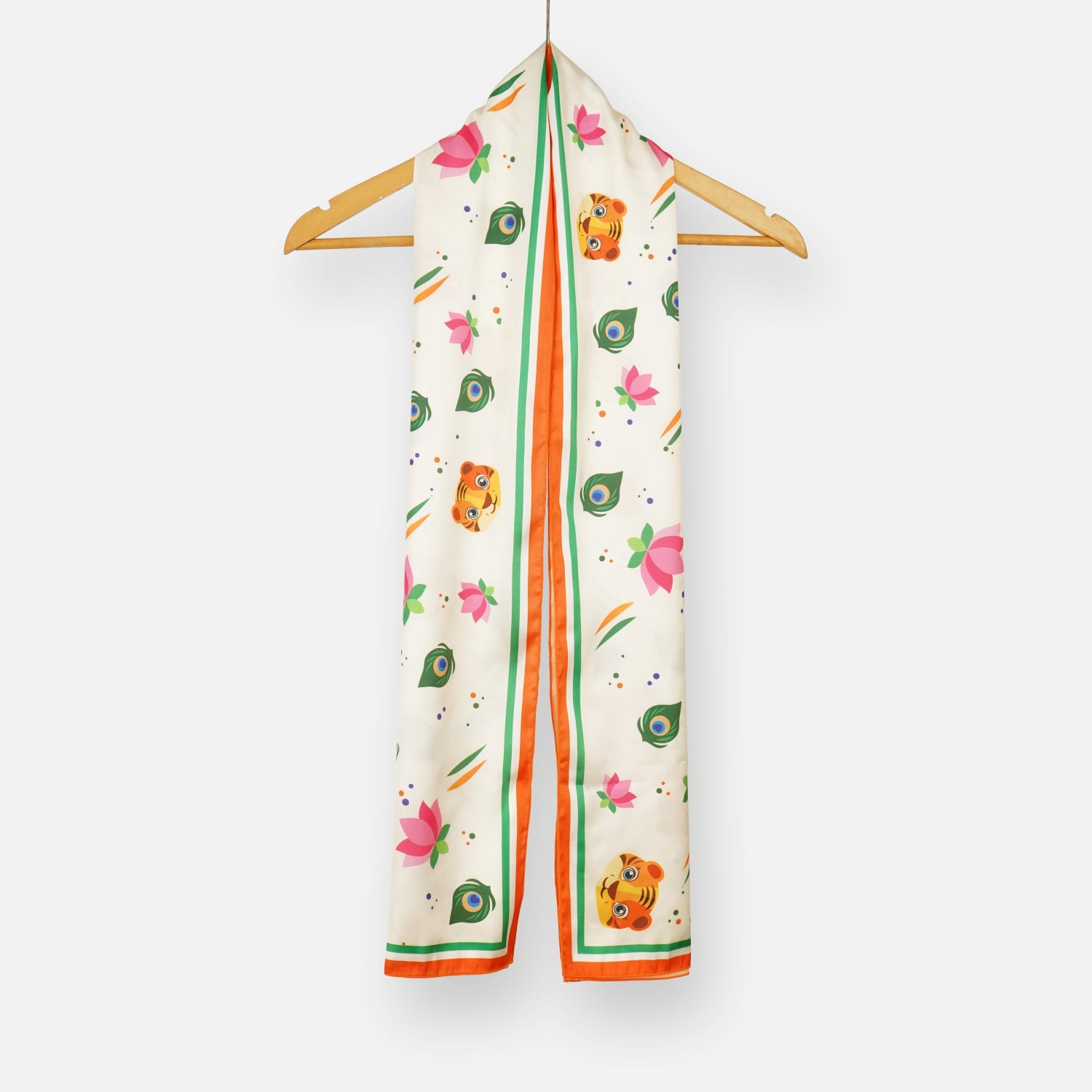 Drape the pride of Bharat with every fold of Luv My India's exquisite digital print satin silk stole, inspired by our timeless national symbols. As soft as a mother’s touch, this stole is made for those who walk with purpose. With it, carry your love for India not just in your heart, but also on your shoulders—with pride, with love, with quiet power.