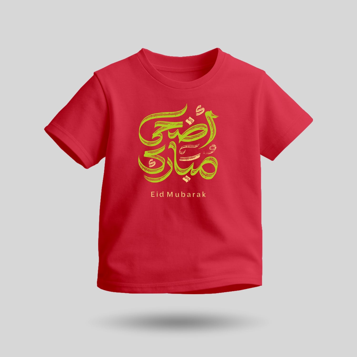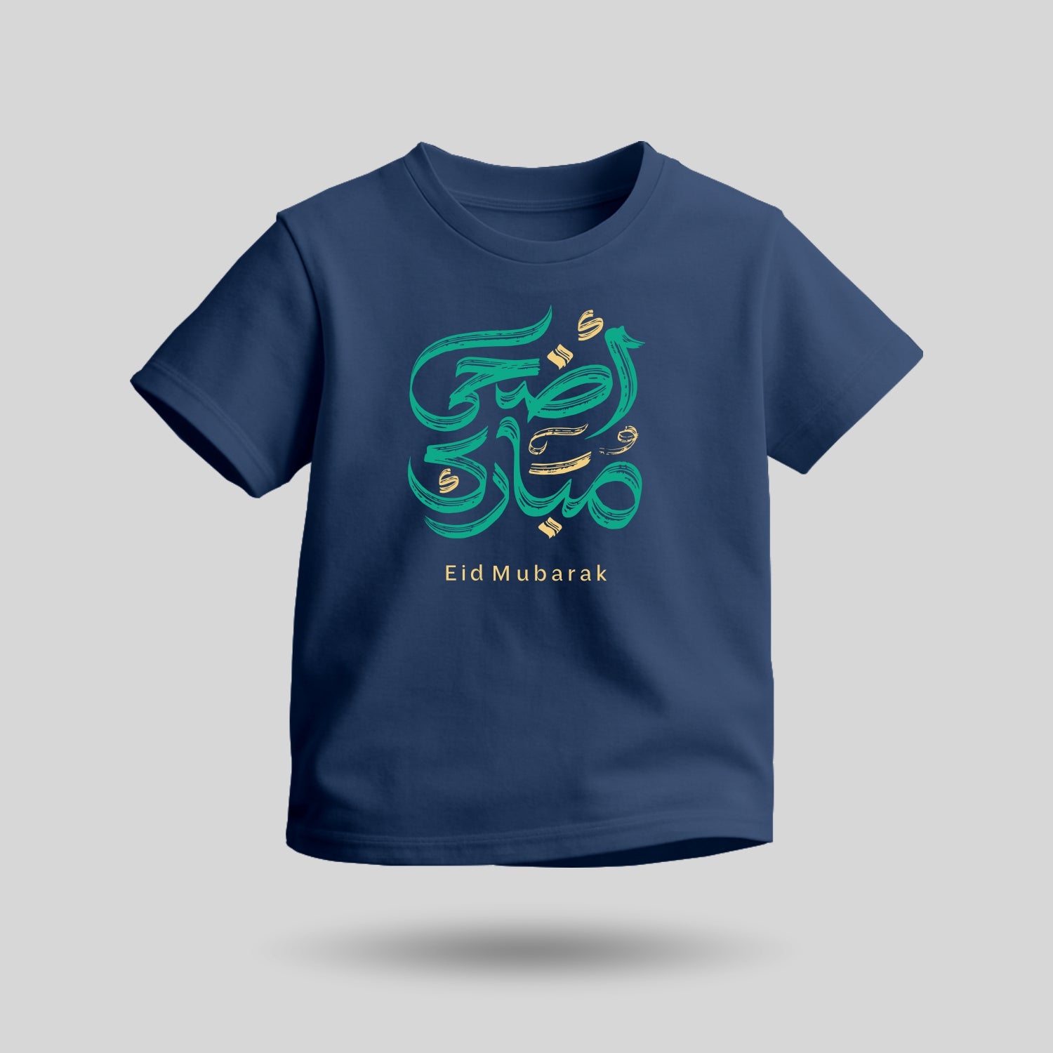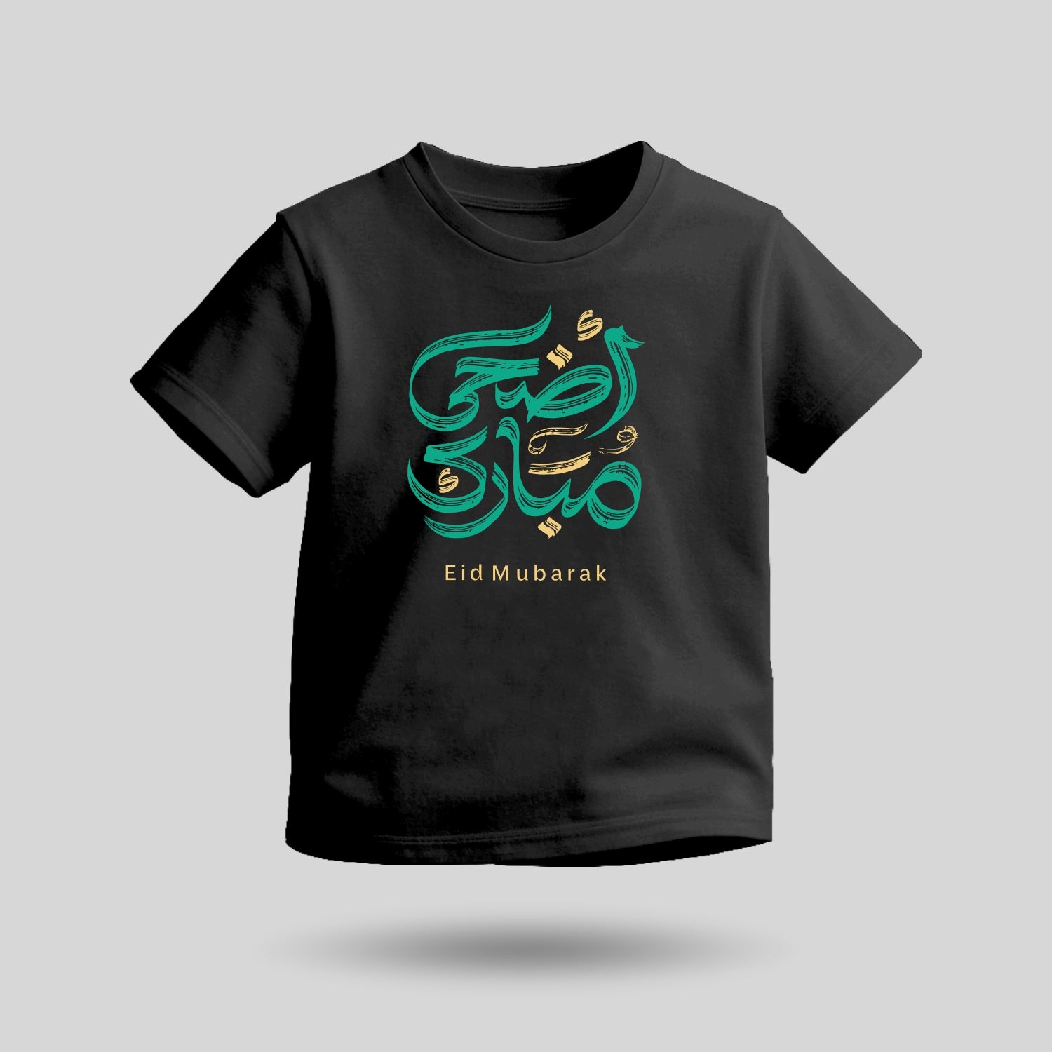 The Eid Mubarak Arabic Script T-shirt features a vibrant artistic interpretation of the Eid greeting written in expressive brush-style calligraphy. The playful strokes and festive colours give the design a lively and modern feel, making it perfect for kids celebrating Eid in cheerful style.