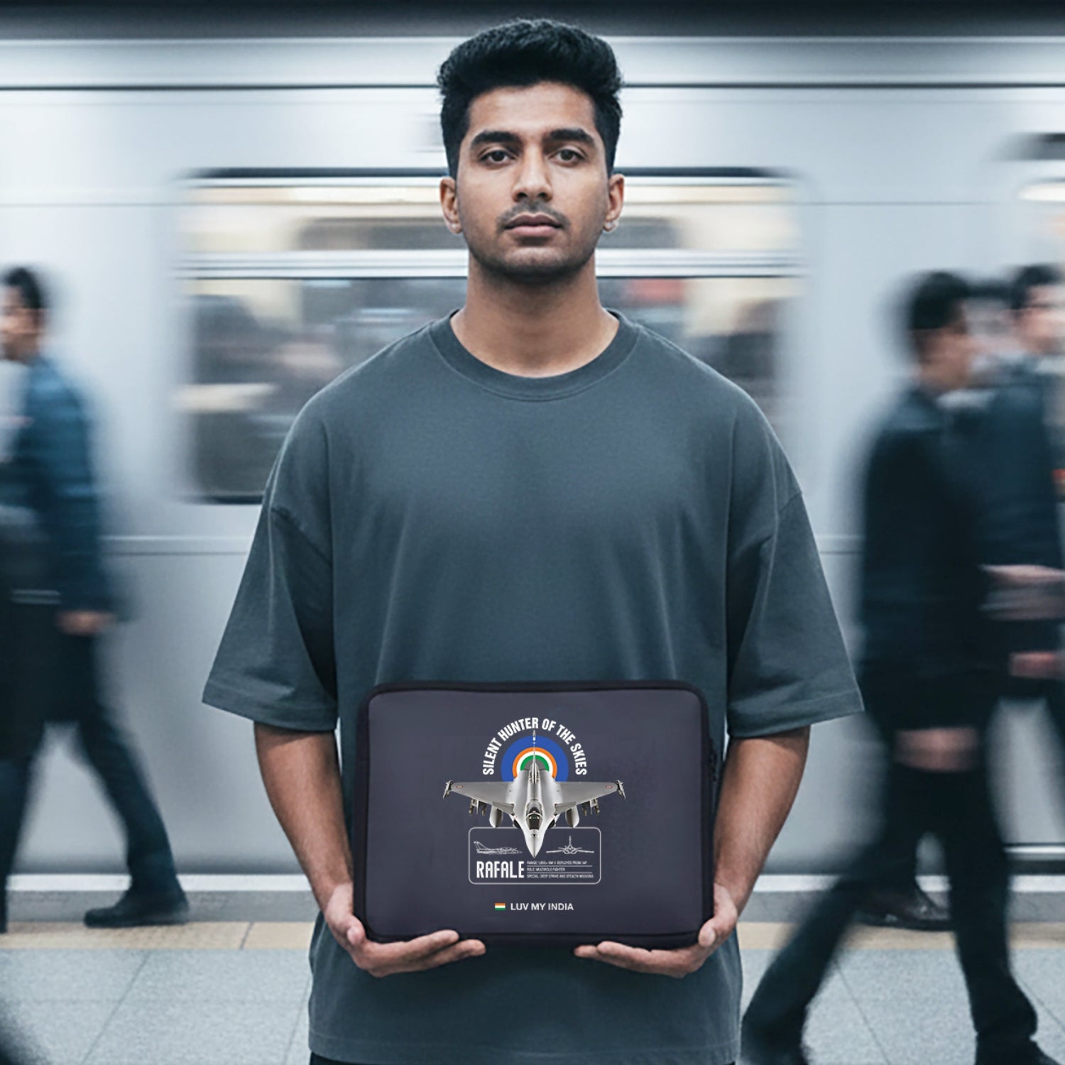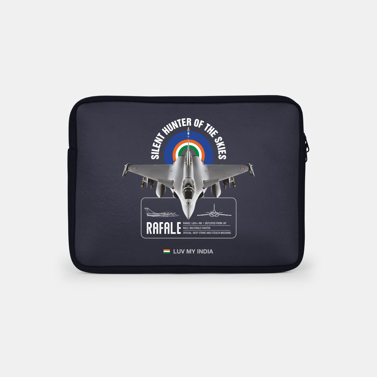 Luv My India’s Rafale themed waterproof Laptop Sleeve Bag carries the weight of national pride and the collective aspiration for a stronger, safer India. Sleek in form and uncompromising in precision, the Rafale represents a new chapter in India’s air capability. This design honours more than an aircraft; it reflects assurance, preparedness and the quiet confidence of onw who knows its strength.